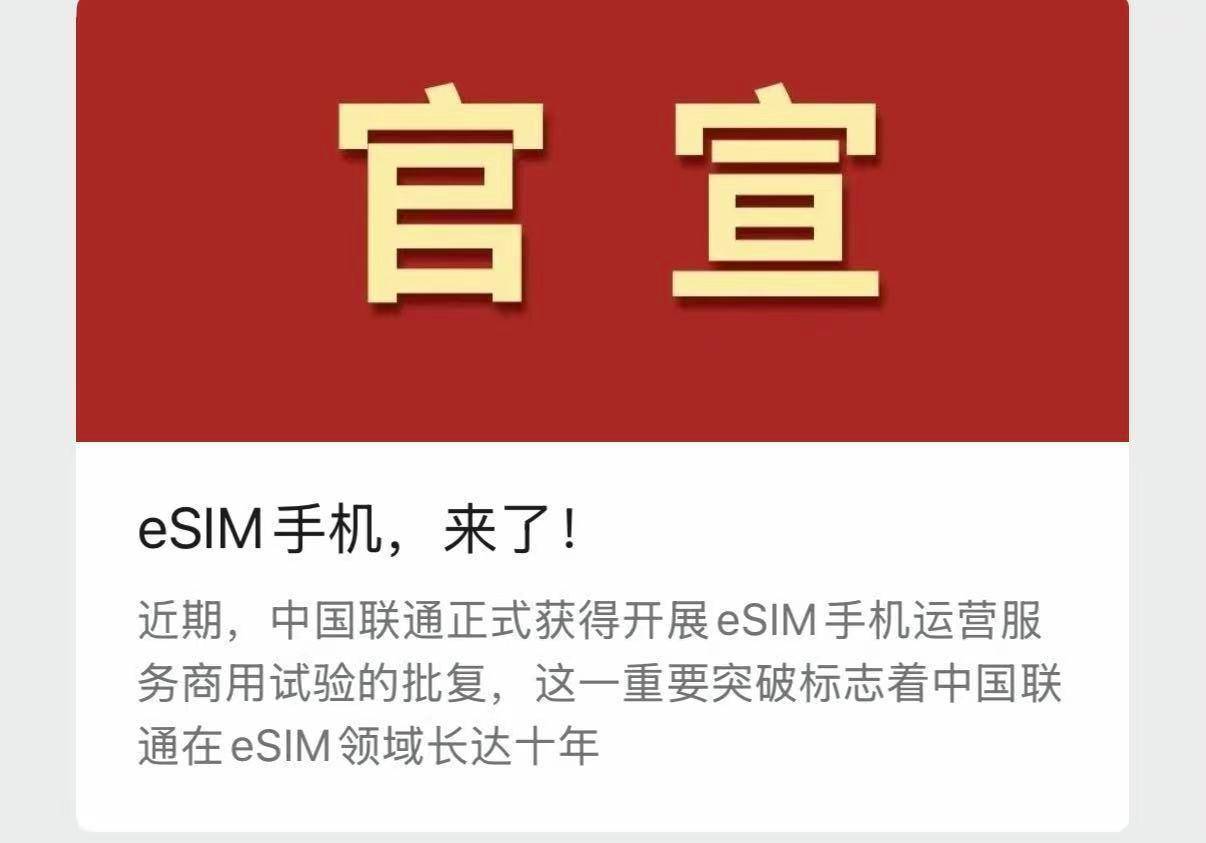 今日中国联通发文称,近期,中国联通正式获得开展eSIM手机运营服务商用试验的批复。