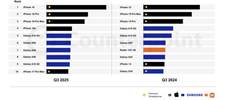 三星和苹果本季度再次完全主导了全球市场。两家公司各自挤出五款车型进入2025年第三季度销量前十。他们与其他品牌之间的差距没有改变,三星最大的胜利也都来自其预算产品线。iPhone 16成为全球最畅销智能手机,获得4%的市场份额,连续第三季度蝉联第一名。印度在这方面发挥了重要作用,这得益于节日季优惠,帮助苹果缓解了新款iPhone 17系列带来的常见低迷。