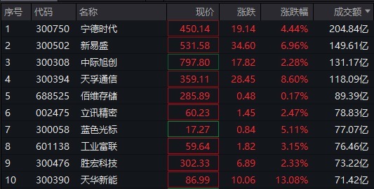 个股方面,中际旭创半日成交额超145亿元居首,华工科技、新易盛、宁德时代成交额靠前。