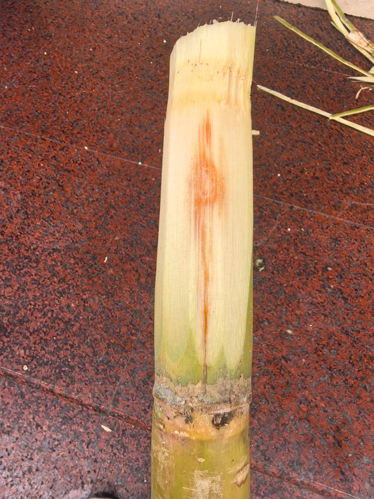 2.看色泽:新鲜甘蔗表皮光滑带白霜,蔗瓤洁白淡黄;霉变甘蔗长霉斑、末端有白毛,切开蔗芯红褐、发黑,就是常说的红心、黑心蔗;